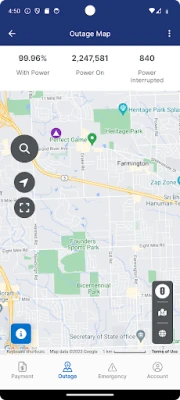Your Location, Storage and Test Access to Protected Storage helps find your location on the outage map and enables Google maps. We also store your address on your device so that you can see your stored locations within the app.