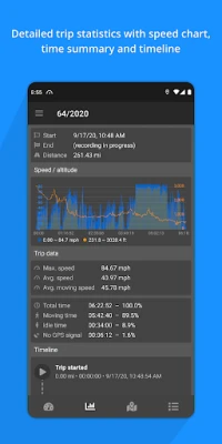 Advanced trip tracker with speed and altitude charts. Trip time summary and a timeline with important trip events (breaks, GPS signal lost, etc.).